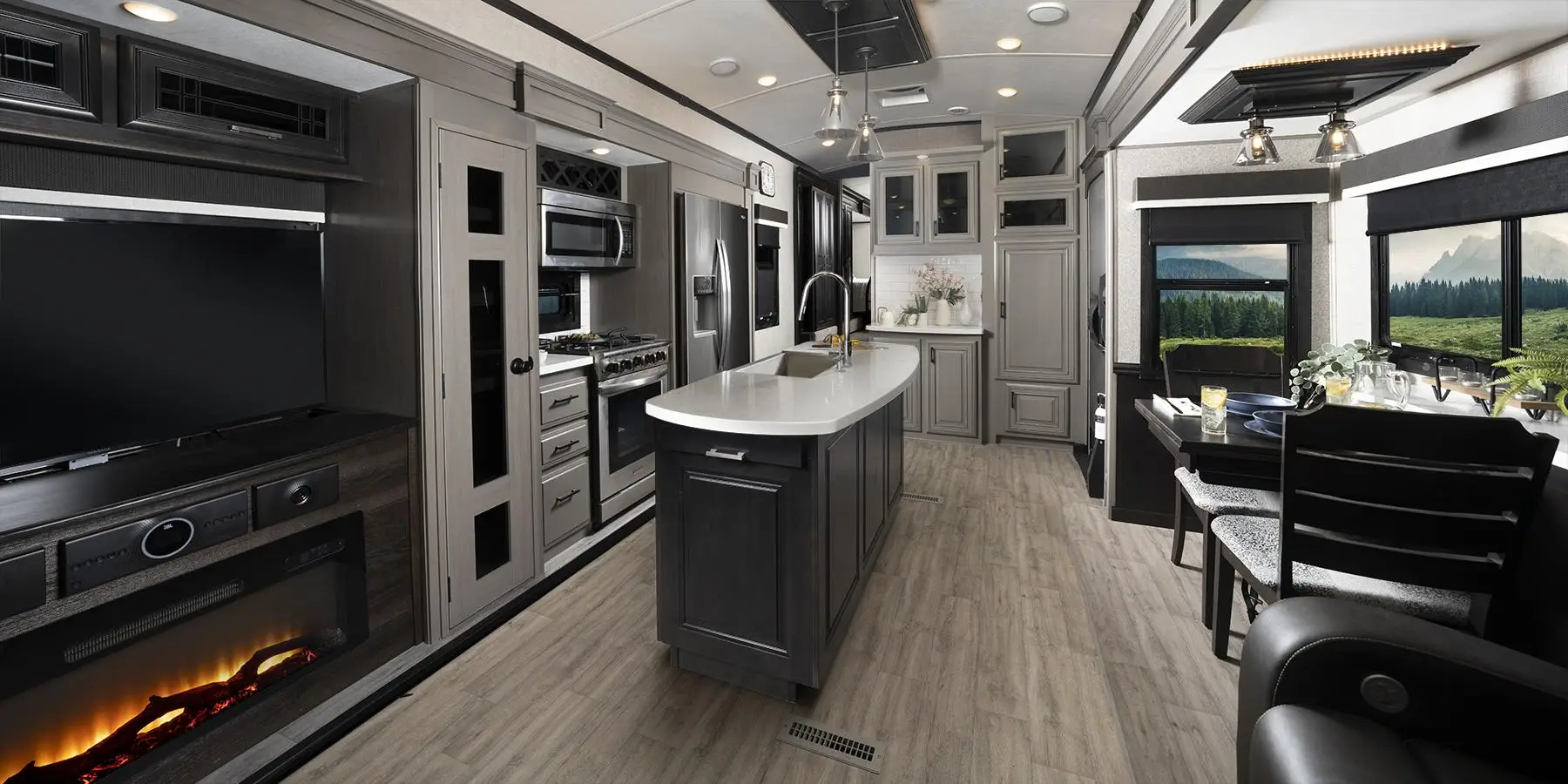 C'est dans les détails intérieurs qu’on peut apprécier tout le luxe et la beauté de la Pinnacle; revêtement de plancher en vinyle de qualité résidentielle pour le plancher principal et ceux des extensions, portes d’armoire en cerisier ou en érable avec glissières anti-claquage, des accents de lumière DEL à plusieurs endroits et un plafond arqué. La cuisine est équipée d’appareils en acier inoxydable dont l’évier, le robinet, le micro-ondes à convection et la hotte de four, le réfrigérateur de 21 pieds cube qui est équipé d’un onduleur de 1200W Pure Sine, une cuisinière Insignia. La table est sans patte pour moins d’encombrement et deux chaises sont pliante pour dégager l’allée au besoin. Les comptoirs sont faits avec un matériel « solid surface », non poreux et imperméable, dans lesquels sont intégrés des prises rétractables. Il est possible de remplacer le réfrigérateur par un modèle à 2 voies Norcold avec machine à glace intégrée dans la porte.