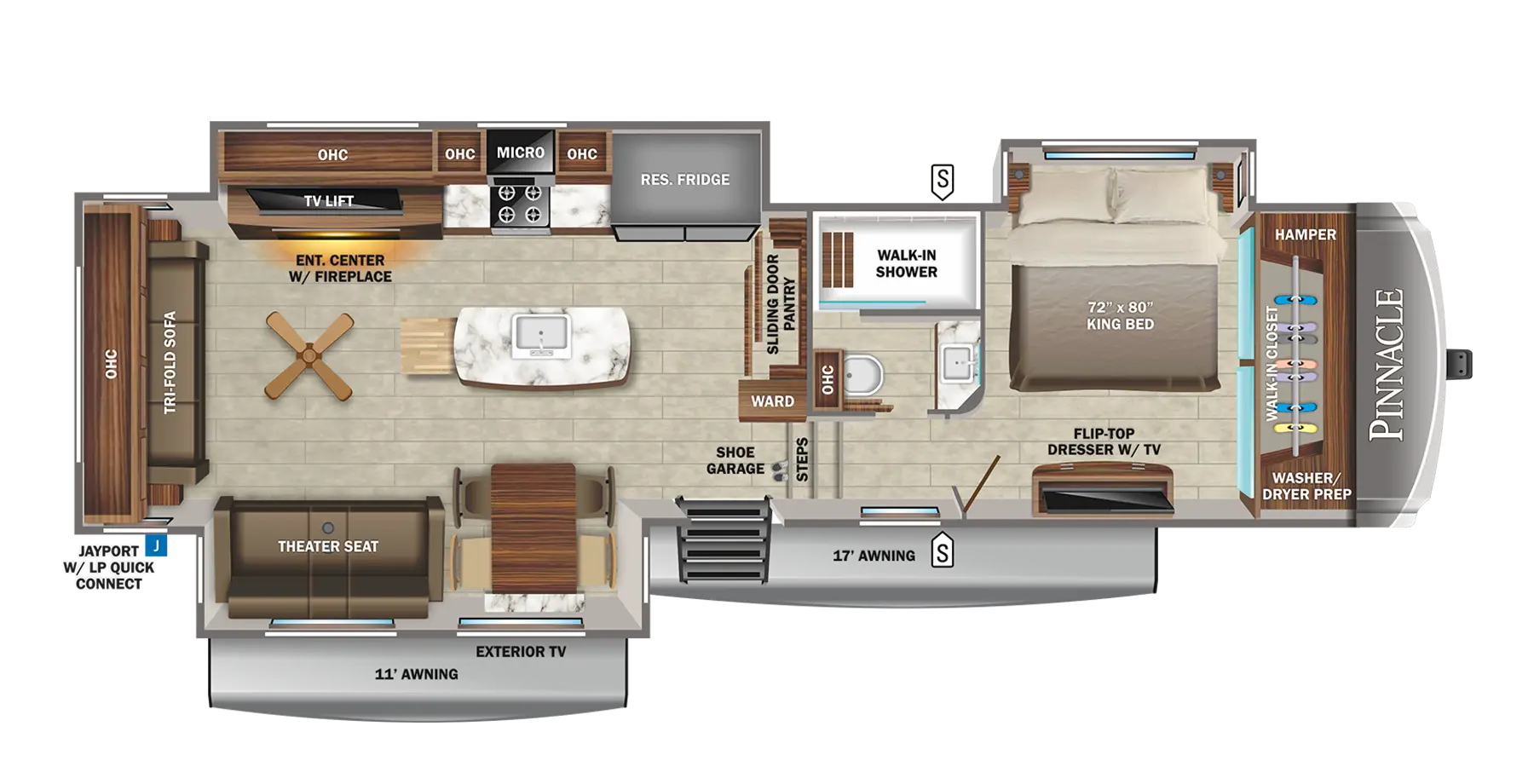 Plusieurs appareils rendront vos séjours plus agréables dont un aspirateur central utilisable à l’intérieur comme à l’extérieur, un chauffe-eau de 12 gallons à recouvrement rapide fonctionnant au gaz propane et à l’électricité, un système de purification d’eau, un système potable indépendant exclusif à Jayco, un centre de divertissement Bluetooth®/HDMI®, un centre de divertissement JBL incluant une télévision Ultra 4K "Fire ready" avec commande vocale au salon, et une barre de son intégrée, un foyer électrique de 5000 BTU, un centre commande JAYCOMMAND™ "Smart RV", une garde-robe avant de style « Walk-In », une télévision de 32 pouces dans la chambre, un matelas King Serta® et des toiles MCD® de fenêtre double, pour un léger ombrage ou plus de noirceur dans toute la fifth wheel. La salle de bain a un évier en acier inoxydable, un dosseret en tuiles, et une toilette en porcelaine. Il est possible d'équiper la caravane à sellette Pinnacle d'un chauffe-eau sur demande Truma.