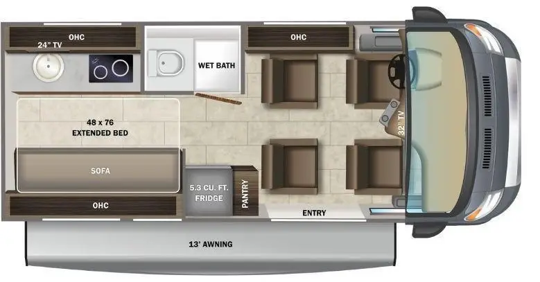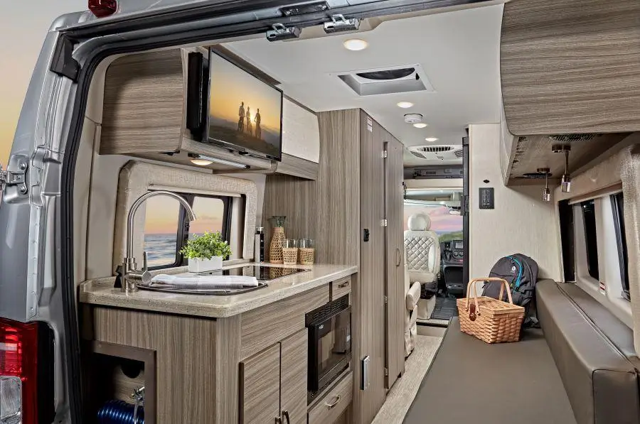 Le VR de classe B Ethos est petit, mais accueillant et bien pensé. Il est offert en deux modèles, le 20A et le 20T, qui offrent chacun leurs avantages et tous les deux une belle finition. Des marchepieds avec lumières DEL facilement l’accès aux portières avant et à la porte latérale coulissante. La porte latérale possède une moustiquaire vous permettant de faire ventiler le VR et de profiter de la brise, même à l’intérieur. Le châssis est fenestré des deux côtés avec des fenêtres coulissantes munies de toile pour plus d’intimité, un rideau magnétique est aussi disponible pour fermer la cabine à l’arrière et un second rideau pour la porte. L’intérieur est composé de panneaux en ABS moulés recouverts d’un fini en vinyle, le plancher à un revêtement de vinyle de qualité résidentielle et le toit est aussi fini avec une couche de vinyle, mais ayant un fini doux.