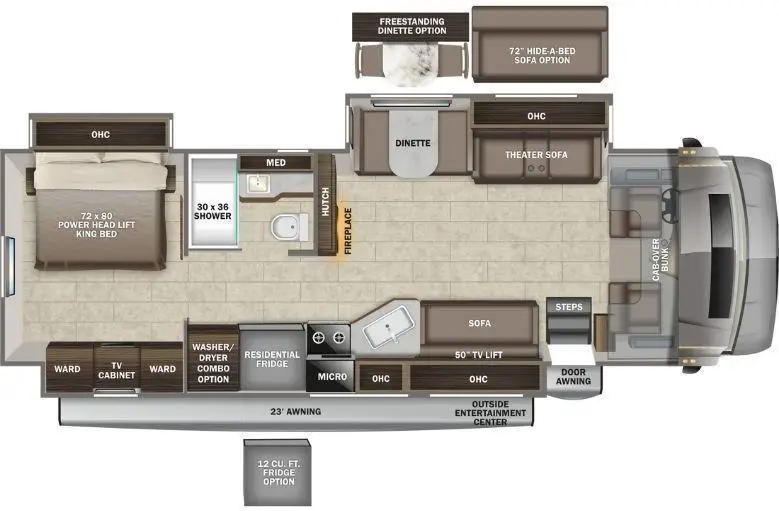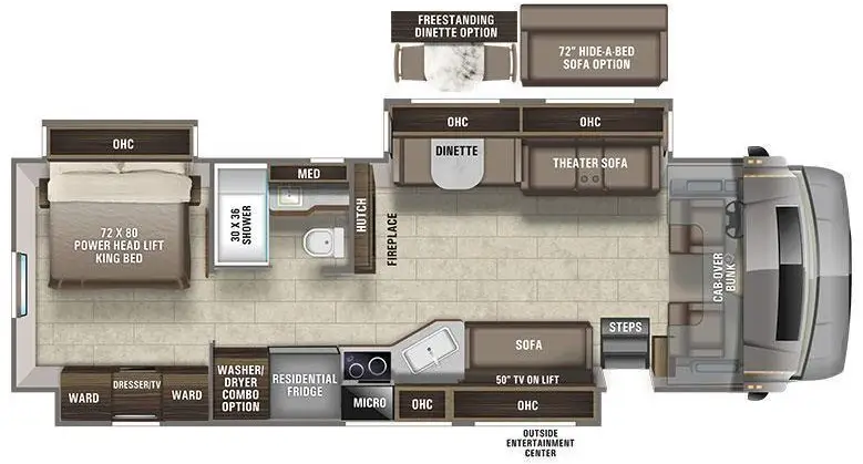 Pour agrémenter vos soirées, le motorisé de classe C Accolade possède un auvent électrique, un éclairage extérieur au DEL, un centre de divertissement avec télévision DEL, une radio et des haut-parleurs, vous pouvez même ajouter une glacière électrique sur un plateau coulissant en option!