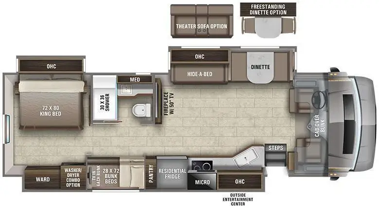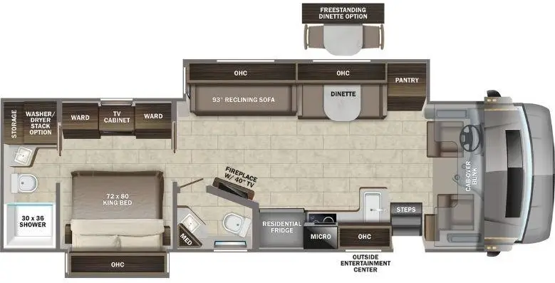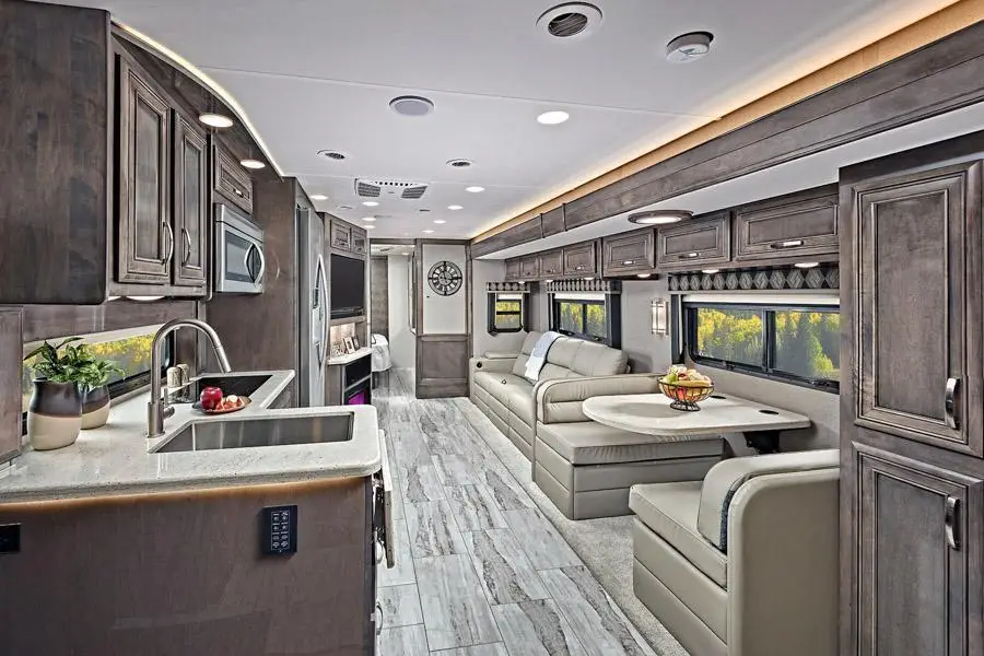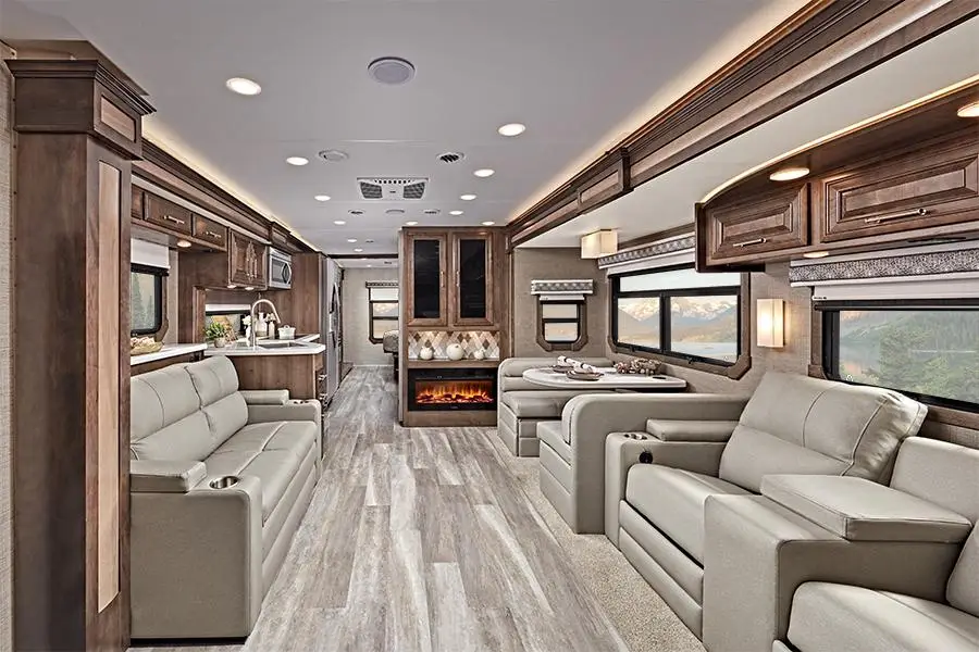 Entegra Coach a pensé à tout lors de la conception du Accolade, le couvre-plancher en planches de vinyle, un plafond dégagé d’une hauteur de 84 pouces avec un fini en vinyle coussiné, des lumières DEL encastrées, un mobilier avec tissus beaux et résistants, des armoires complétement en bois francs et pentures dissimulées, des comptoirs « solid surface » avec évier en inox intégré et des lumières d’accent. L’espace principal offre une dinette avec table sans patte et banquettes ou une table avec quatre chaises en option ainsi qu’un divan-lit, un fauteuil cinéma ou un fauteuil inclinable selon les modèles. Vous y trouverez également un foyer électrique Furrion®, une télévision Insignia Fire Smart connectée à une antenne Winegard® 2.0 pouvant être améliorée facilement pour amplifier le réseau WiFi et recevoir le 4G et une antenne satellite WInegard In-motion. Il est possible de changer l’antenne satellite pour le modèle Canadian Shaw® TRAV'LER® ou Winegard® TRAV’LER®.