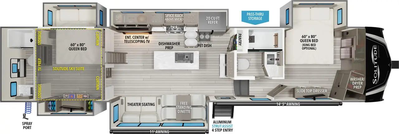 L'aire principale comprend le panneau de contrôle Compass Connect vous permettant de monitorer les réservoirs et les appareils de la roulotte. Le modèle 160LG a une grande dinette en U à l'avant avec une télévision intelligente 12V. La table est mobile sur son support, vous pourrez donc la coulisser vers un côté ou l'autre pour vous mettre à l'aise et même l'abaisser pour convertir la dinette en lit. Le lit principal est de dimension Queen et se situe à l'arrière, il est possible de faire ajouter une seconde télévision intelligente de 24 pouces à l'arrière.
