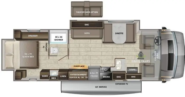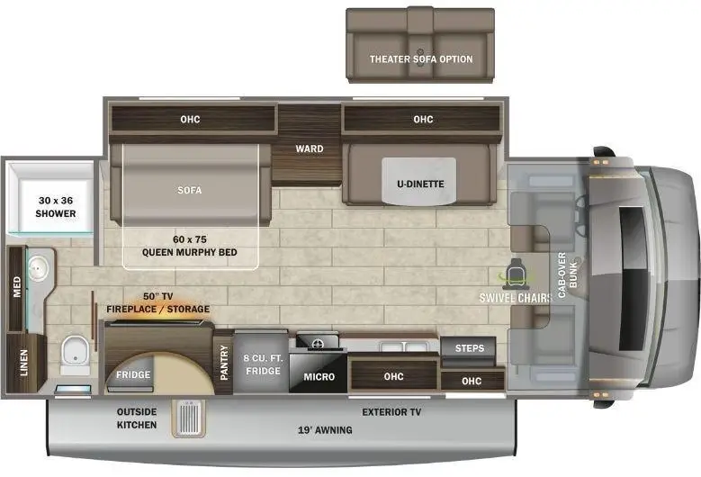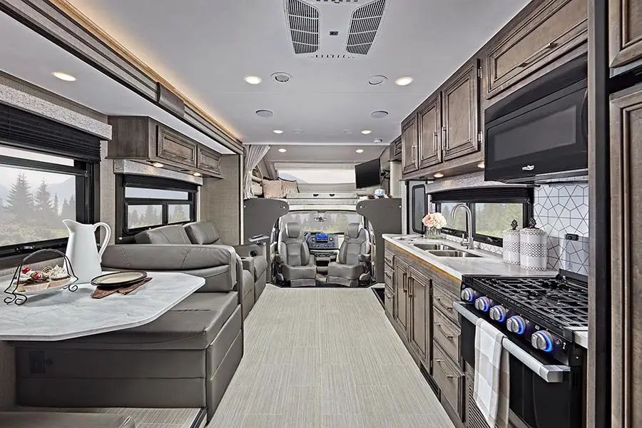 L’espace principal offre un divan, une dinette, ou encore un fauteuil cinéma ou une combinaison dinette et fauteuil selon la configuration du modèle. Vous y trouverez également une télévision Insignia Fire Smart 32 pouces connectées à un antenne Winegard 2.0 avec amplificateur de signal, préparation pour un réseau 4G LTE et un filage en prévision d’une entrée satellite, un système de son avec radio et un centre de contrôle complet.