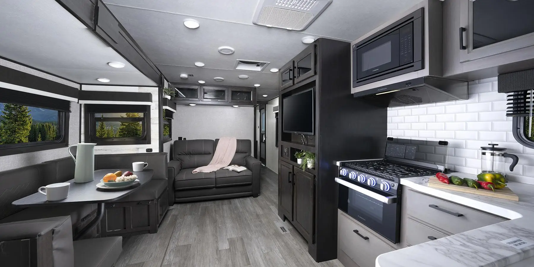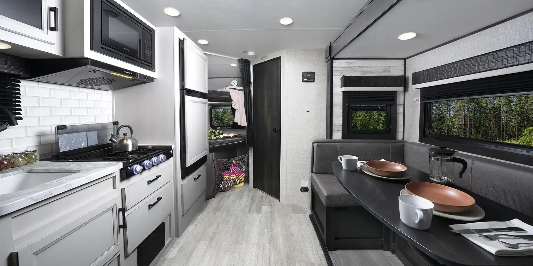 L’intérieur de la roulotte Jay Feather sera également à la hauteur de vos attentes avec un choix de décor en bois teint gris ou des armoires blanches pour une ambiance lumineuse. L’ensemble de la roulotte est éclairé avec des lumières DEL et le plancher principal et celui des extensions sont recouverts d’un vinyle de qualité résidentielle ayant un fini "planches de bois". Pour ajouter au style, des panneaux de verre fumé sont insérés dans certaines portes d’armoires, les poignées ainsi que la robinetterie font un contraste avec leur couleur noire, et le réfrigérateur de 6 pieds cube fonctionnant au gaz propane et à l’électricité est agencé à la finition. La cuisine offre également un micro-onde, un four Furrion avec 3 ronds de poêle, un grand évier à deux cuves ainsi qu’un comptoir avec une finition de qualité résidentielle avec des prises électriques et USB rétractables. Le réfrigérateur peut être remplacer par un modèle de 8 pieds cube fonctionnant au courant 12V.